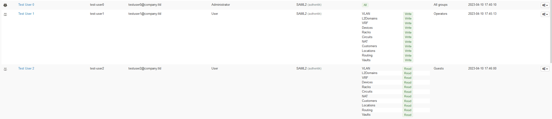 From here, you should be able to login as each of the test-users and see the affects the saml attributes has with the permissions set. These can be fine tuned as needed by following the phpipam documentation, but should be enough to get a basic permissive installation working with authentik as the SAML provider.